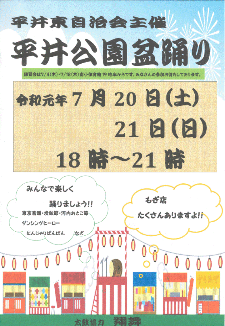 地域情報 7月版 ①Masuda CKM2019年7月13日読了時間: 1分更新日:2019年7月16日今月20日(土)21日(日)平井公園にて盆踊りが開催されます!大改修工事が行われてから、初めての盆踊り。ゴーカートやプールは無くなってしまいましたが、広く綺麗になった公園でみんなで踊りましょう!